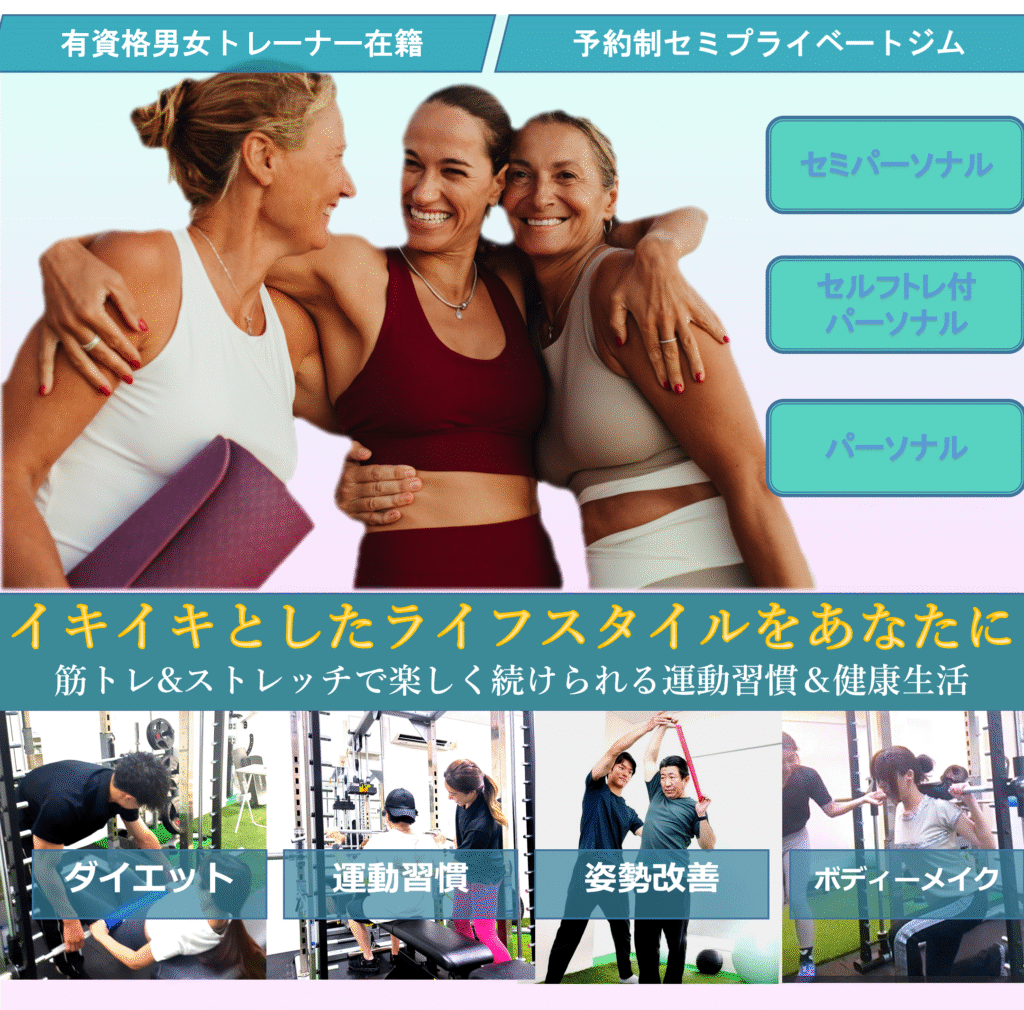 「腰痛がある」 「肩こりがある」 「姿勢改善したい」「ダイエットしたい」 「美脚・美尻になりたい」 「腹筋を割りたい」「生活習慣病を改善したい」 「ミドル・シニアでもできる運動習慣を付けたい」