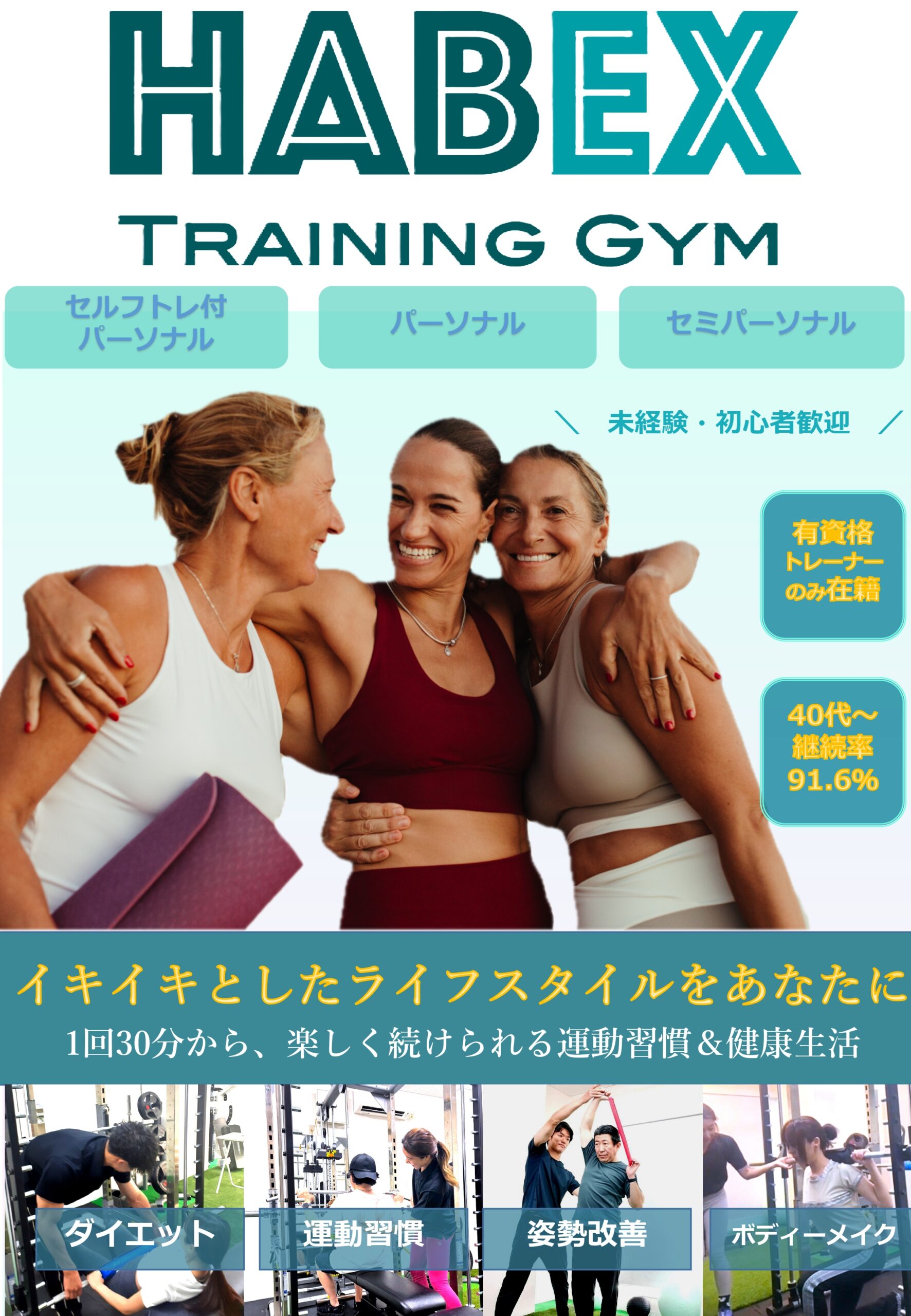 ➡HABEXは20代から70代まで幅広い会員が在籍。 40代からの継続率91.6%