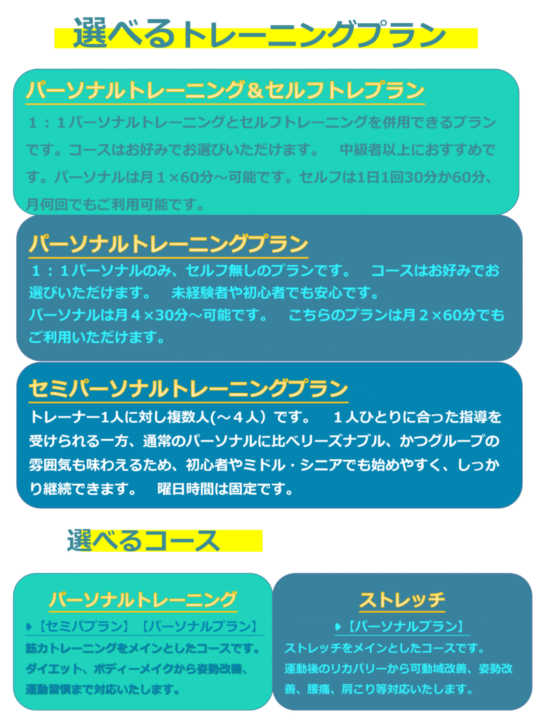 パーソナルトレーニング指導を通じて当ジムのマシンや機材の使用に慣れていただくためのチュートリアル的なコースであり、回数は30分8回、もしくは60分4回、料金は¥30,800(税込)です。<ビギナーコース>を受講しセルフトレーニングご利用のお客様からは、施設利用料として月会費を頂戴させていただきます。 料金は上記料金表に含まれております。 セルフトレは1日1回30分、または60分、通い放題です。
